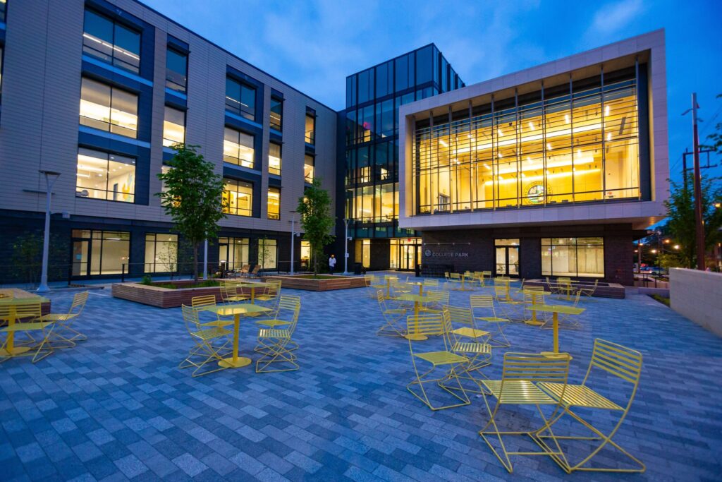 Completed on time and within budget, College Park City Hall is a visual reminder of the possibilities of strong town-and-gown relations. Though completed in December of 2021, the rapport necessary to execute the (admittedly) risk-intense project did not occur by chance. The project’s success was made possible by a decades-long commitment of both the City of College Park and the University of Maryland to cross-sector collaboration. This shared commitment, observable in real-time throughout the city, is further codified in the formation of the College Park City-University Partnership. Founded in 1997, College Park’s community development nonprofit is a conduit of several successful development projects, including: College Park Academy, the College Park Community Preservation Trust, and the Partnership’s Live+Work Program.